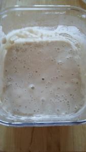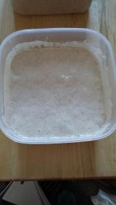 I’m going to put half of it aside to freeze, and keep the other half to feed and use occasionally. It looks dark because I use wholemeal rye to feed it, and at the moment I can tell it’s still very healthy as it floats when added to water (a good tip from Bread Ahead). I also had some white sourdough starter which I’d been feeding with strong bread flour. I decided to experiment and divide it in two, feeding one lot as usual. It now looks like this, also straight from the fridge: